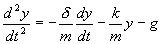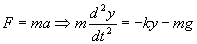 Newton's first law guides us from this point on. The total force on the mass is -ky - mg. The mass times the acceleration is m(dvy / dt) = m(d2y / dt2), where vy is the up-and-down velocity of the mass and dvy / dt is the rate of change of that velocity. That velocity is, in turn, the rate of change of the y coordinate of the mass block, that is, vy = (dy / dt). So, the acceleration is the second rate of change of y, and we write it as d2y / dt2 because that's the way Newton and Leibniz first wrote it 350 years ago. We have the following dynamic equation for the motion of our mass block.