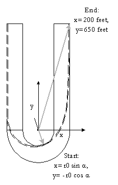 In the previous instalment, we did exact calculations for a dummy line down a 650-foot entry straight, a 180-degree left-hander, and a 650-foot exit chute. Cornering radii vary from 150 feet to 200 feet, and the track is 100 feet wide all the way around. This dummy line carries constant speed around the entire left-hander. We did those calculations to provide reference times to compare against this month's more sophisticated calculations, in which we unwind the steering wheel and accelerate at the same time. The baseline times for the dummy line over the whole course, as a function of cornering radius, are in the second-to-last column of the following table:
