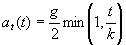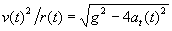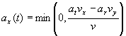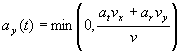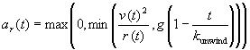 accounting for unwinding the steering wheel; in steps from the inner parentheses outwards: g(1 - t / kunwind) slowly decreases from g as time increases from 0, but, it is never allowed to exceed v2 / r, by the min expression, as mandated by the traction circle, and then, never allowed to be negative, by the max expression, because we don't want to start turning back toward the entry straight; depends on columns 1 and 3.