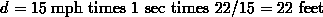 If we are to do mental calculations, the first hurdle we must jump comes from the fact that we usually measure speed in miles per hour (mph), but distance in feet and time in seconds. So, we must modify our equation with a conversion factor, like this