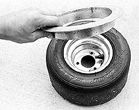 examples. Other tools are available, but I prefer the ring because it is so easy to use. It is fast, and small enough for those trailers that do not have room for a bulky unit. It will even fit in a tool box. To use the ring, place the tire on its side and place the ring around the rim on the side wall of the tire with the flat edge of the ring facing up (Example 1).