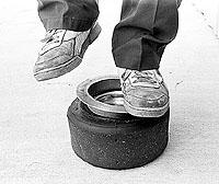 Now place one foot on the flat edge covering about half of the ring and stand up on the ring. Hold onto something and stabilize yourself. Stomp firmly with the other foot on the open half of the ring (Example 2). If the bead does not break loose on the first try, try again until it does. Remember to break down both sides of the tire. This procedure for breaking the bead loose will work on one and two piece wheels.
