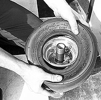 squeeze the beads together just like when you removed the used tire. This will be a little more difficult because the tire is new. Hold the tire at a 45 degree tilt and start to work the tire onto the rim, using a slight twisting motion. Do this for both beads of the tire and, FLASH! Youre done! Almost.